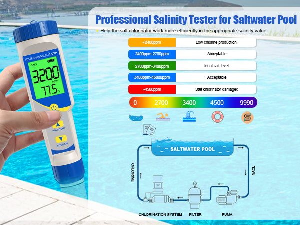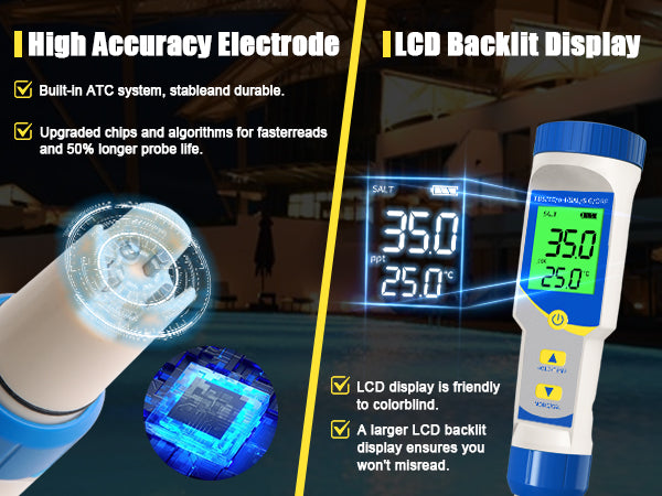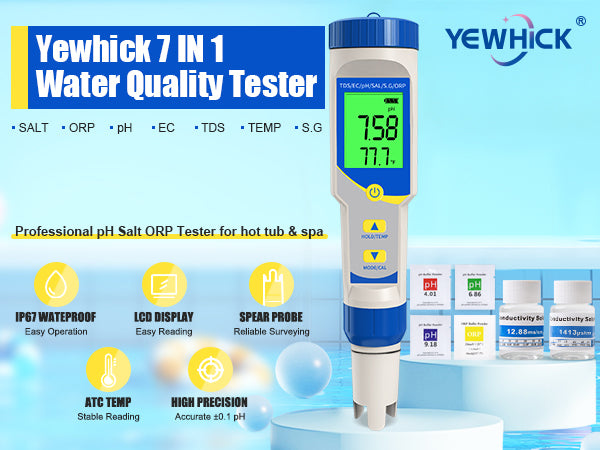 Achieve precise water quality monitoring with this advanced 7-in-1 digital tester. Ideal for swimming pools, aquariums, spas, hydroponics, and environmental monitoring, it accurately measures key parameters including salt, ORP, pH, EC, TDS, temperature, and specific gravity (S.G.). The upgraded high-accuracy probe, backlit LCD display, and simple calibration ensure easy and reliable readings in any environment.