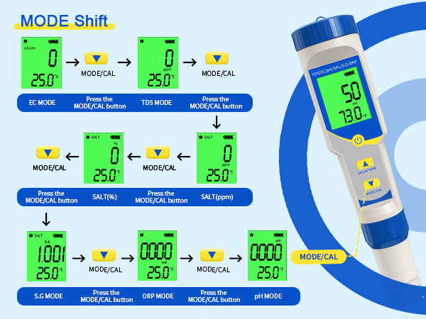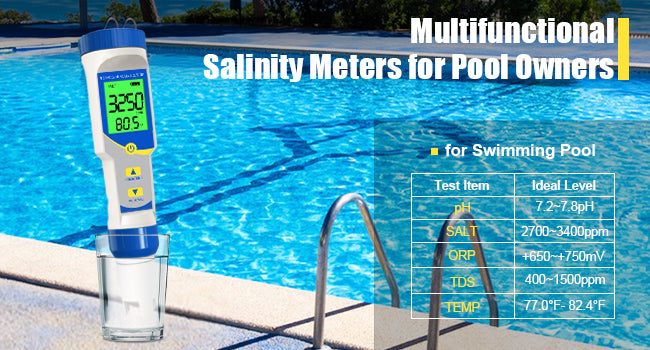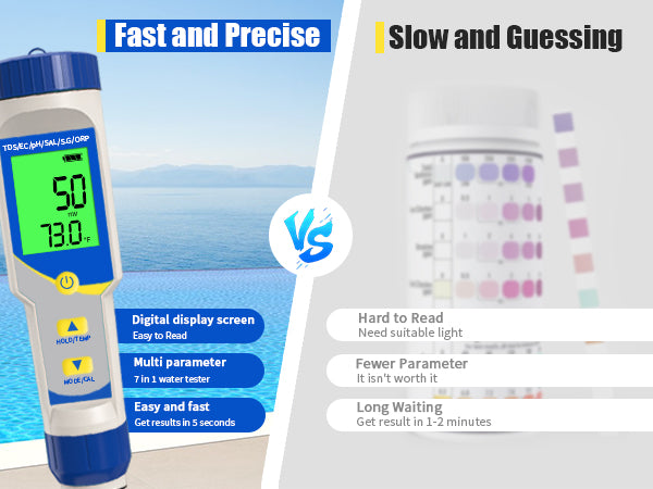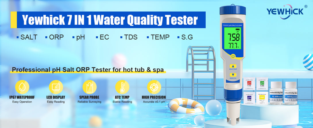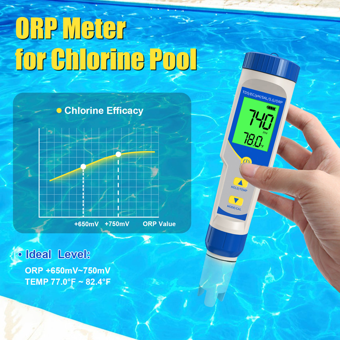 Measures seven essential parameters—pH, salt, TDS, EC, ORP, temperature, and specific gravity—in a single device, providing unparalleled convenience for various water quality monitoring needs.