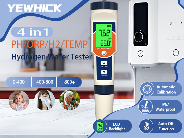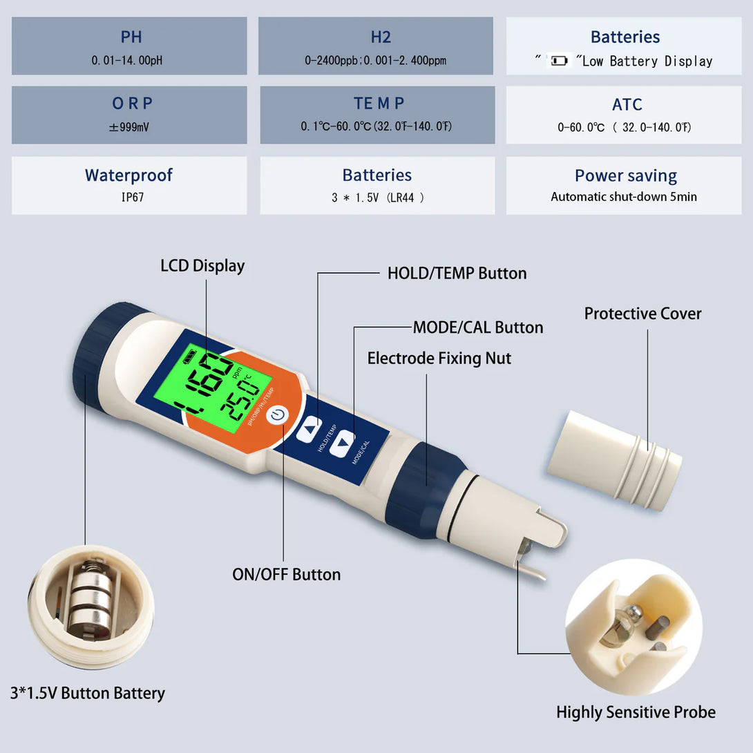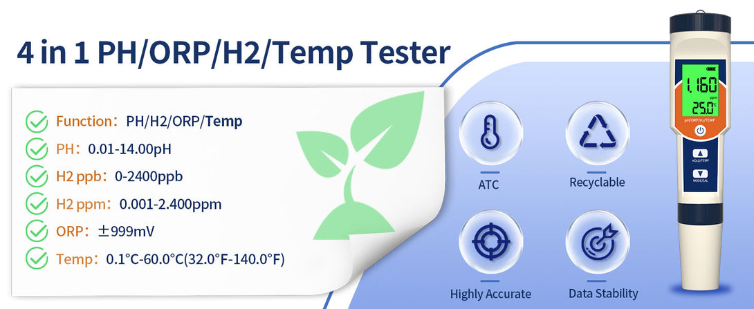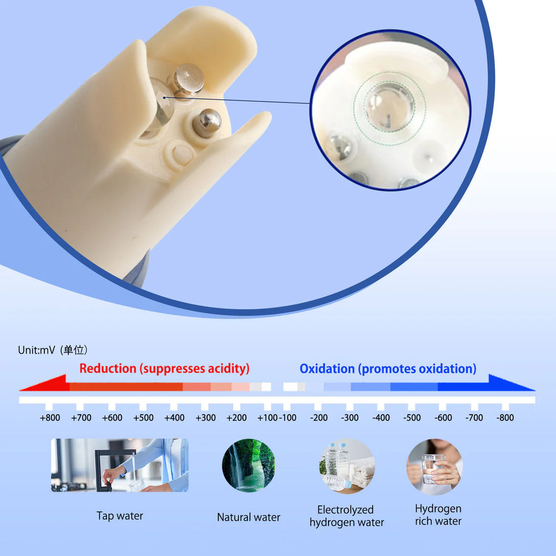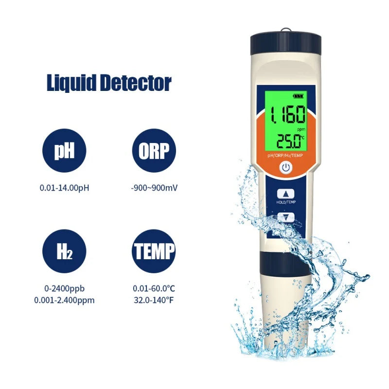 Measures four key parameters—pH, ORP, hydrogen content (H₂), and temperature—in one compact device, simplifying water quality assessment for various applications.