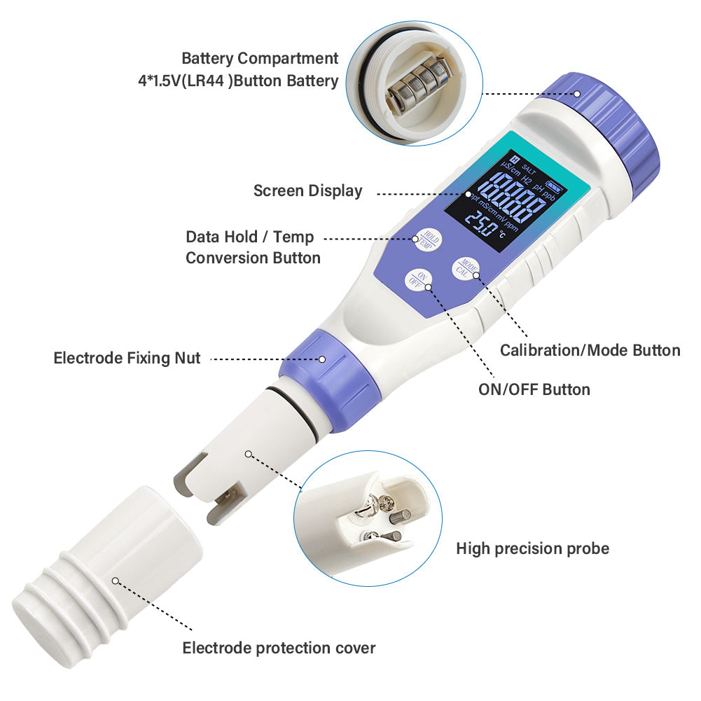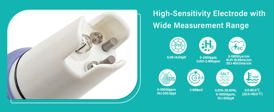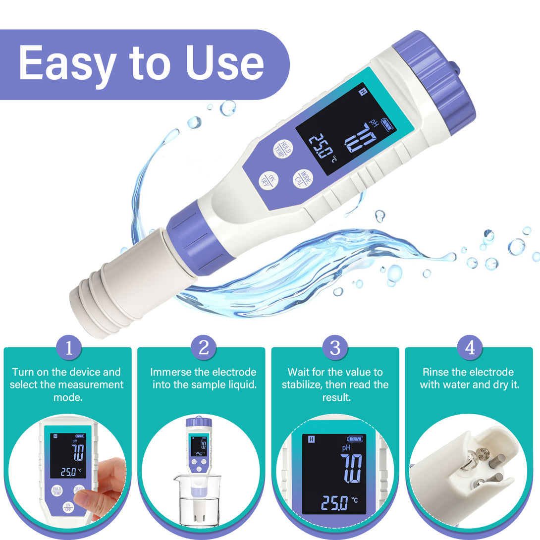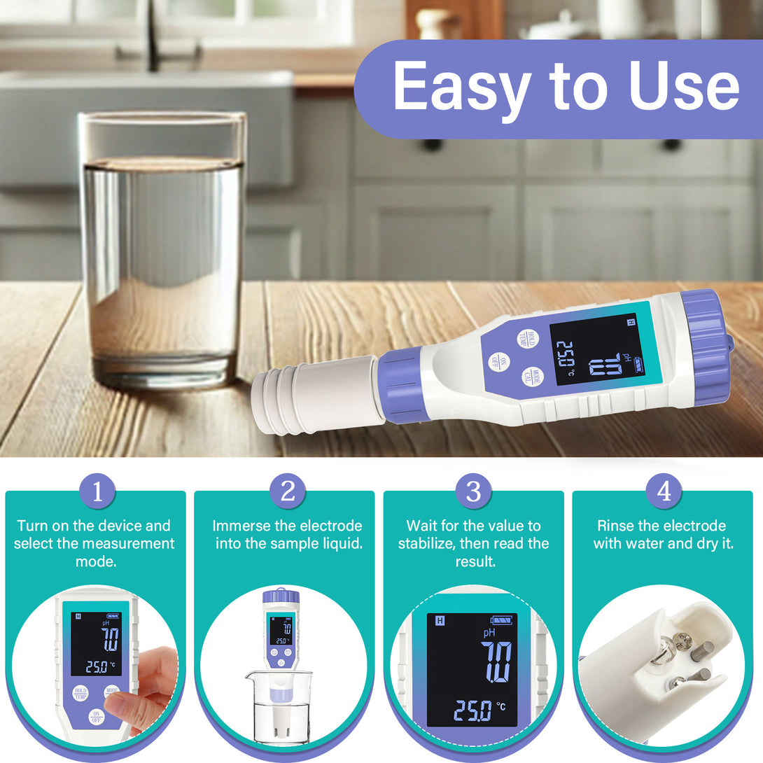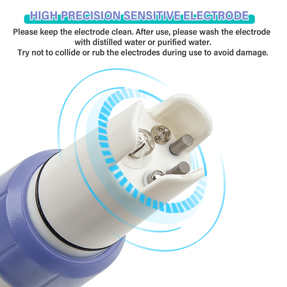 This image highlights the high-precision sensitive electrode of the 7-in-1 digital water quality tester, designed to ensure accurate pH measurement, reliable TDS detection, and stable EC and ORP readings in various water quality applications. Built with durable sensor components, the electrode is easy to clean and maintain—just rinse with distilled water or purified water after each use to preserve accuracy and extend device life. This essential component guarantees consistent performance in drinking water, aquariums, hydroponics, and pool testing.