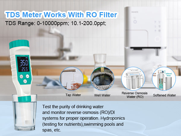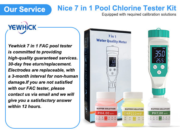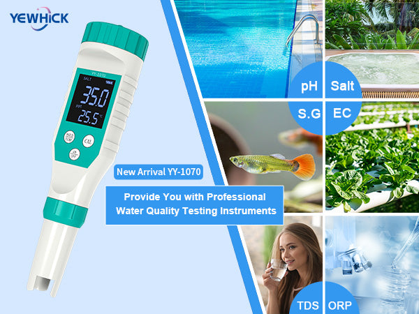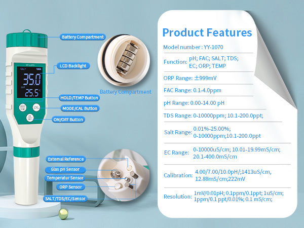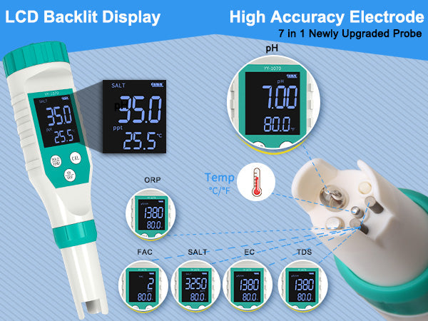 Multi-Parameter Water Quality Tester – This 7-in-1 water testing meter is designed to deliver fast and reliable measurements of seven essential water parameters: pH, TDS (Total Dissolved Solids), EC (Electrical Conductivity), Salinity, ORP (Oxidation-Reduction Potential), Free Available Chlorine (FAC), and Temperature. Ideal for a wide range of applications including drinking water testing, aquaculture, hydroponics, swimming pools, and laboratories.